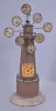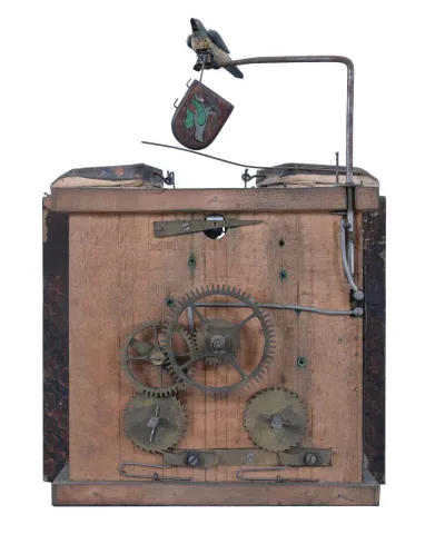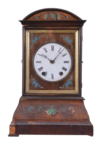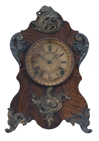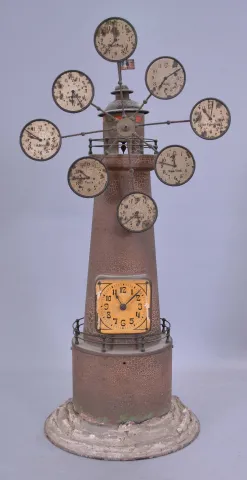 Clocks- 3 (Three) Shelf Clocks: (1) Probably Ketterer, Aron or Theodor, Furtwangen, Germany, 50 hour, time and strike, spring driven shelf cuckoo with inlayed veneer case and white enamel dial; (2) Germany, Junghans, "World Time" lighthouse clock, 8 day, time only, spring driven clock with 8 small dials for global times and local time showing on the larger dial in the base. A drive shaft extends upward from the movement to turn the armed wheel. Counterweights on the each of the 8 sets of motion works cause the time to advance on the small dials; (3) Ansonia Clock Co., New York, " Rouen" 8 day, time and strike, spring driven mantel clock in a grain painted iron case, c1894. (1) missing pieces of case molding and feet. Case, veneer, inlay, bellow, and movement will all need restoration; (2) Some of the grain painting has rubbed off of the case. Gilding on spelter ornaments is gone in places. Pendulum is missing. Movement will need to be serviced; (3) Bezel and glass are missing. Original paint is missing in places and very cracked elsewhere. Dark spots on small dials. Some loss to textured base. Pendulum is a replacement. Original movement is complete and will tick when you move the verge manually. Not tested long term. Sold "as is".