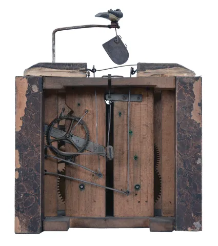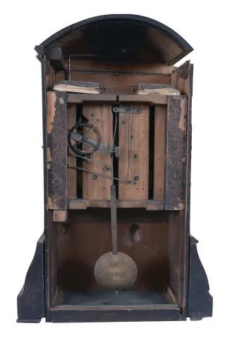 (1) missing pieces of case molding and feet. Case, veneer, inlay, bellow, and movement will all need restoration; (2) Some of the grain painting has rubbed off of the case. Gilding on spelter ornaments is gone in places. Pendulum is missing. Movement will need to be serviced; (3) Bezel and glass are missing. Original paint is missing in places and very cracked elsewhere. Dark spots on small dials. Some loss to textured base. Pendulum is a replacement. Original movement is complete and will tick when you move the verge manually. Not tested long term. Sold "as is".