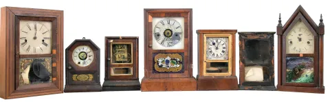 Clocks- 7 (Seven): (1) Elisha Manross, Bristol, shelf clock with a spring driven 30 hour time and strike movement in a rosewood veneered case with inlay, c1850; (2) Seth Thomas, Plymouth Hollow, Conn., cottage shelf clock with a spring driven 30 hour time and alarm movement in a rosewood veneered case, c1850. (3): Brewster & Co., Bristol, Conn., cottage shelf clock with a spring driven 30 hour time and alarm movement in a rosewood veneered case, c1850. (4) Seth Thomas, Plymouth Hollow, Conn., cottage shelf clock with a spring driven 30 hour time and strike movement in a rosewood veneered case, c1850. (5) Daniel Pratt, Reading, Mass., cottage clock with a spring driven 30 hour timepiece movement in a rosewood veneered case, c1855. (6) S. B. Terry, Terryville, Conn., shelf clock with a 30 hour timepiece movement (incomplete) in a paper finished case, c1850. (7) Waterbury Clock Co., Waterbury, Conn. steeple shelf clock with a spring driven 30 hour time and strike case in a mahogany veneered case, c 1855. (1) The finish has been lost. The dial has been repainted. The hour hand is missing; (2) The dial board, dial and minute hands are replacements. There is minor veneer loss. The finish is heavily mottled. The glass tablet is cracked. (3) The dial is missing. The hands are replacements, There is some veneer loss. (4) There is veneer loss. The dial has been poorly repainted. The "ST" hands are original. The base is loose and needs to be reglued. (5) There is veneer loss. The gilt pieces have been painted gold. The dial has darkened and is showing loss. (6) The front plate to the ladder movement is missing. The hands and dial are missing. The paper finish is largely dried out and gone. (7) There is veneer loss. The dial has paint loss and the hands are missing. ***NOTE*** The dimensions are for clock number 4.
