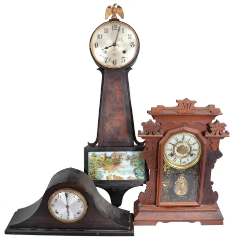 Clocks- 3 (Three) wood cased clocks: (1) New Haven Clock Co., New Haven, Conn., "No. 540", 8 day spring driven, time & strike with alarm parlor clock in a walnut case, c. 1890; (2) Wm. L. Gilbert Clock Co., Winsted, Conn., "Yorktown", 8 day spring driven, time & strike banjo clock with mahogany finish and burl veneer panel, c. 1930; (3) Wm. L. Gilbert Clock Co., Winsted, Conn., tambour clock, 8 day spring driven, time & bim-bam strike tambour clock in a walnut case, c. 1930. all clocks in need of service. Dimensions provided are for the banjo clock. Sold "as is".