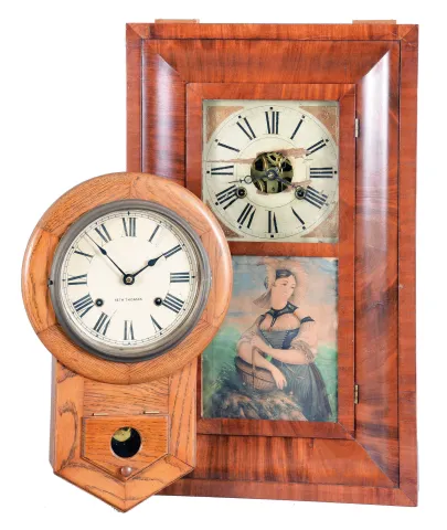 Clocks- 2 (Two) American Wood Case: (1) Dilger & Co., ogee clock, 30 hour, time and strike, weight driven in a walnut veneer case with painted wooden dial; (2) Seth Thomas Clock Co.,Thomaston Conn., "Drop Octagon 8 Inch", 8 day, time and strike, spring