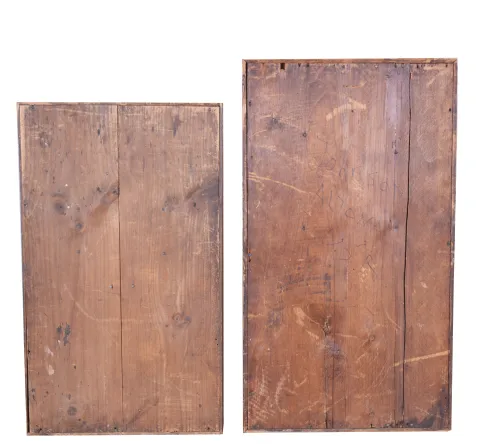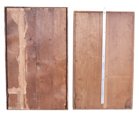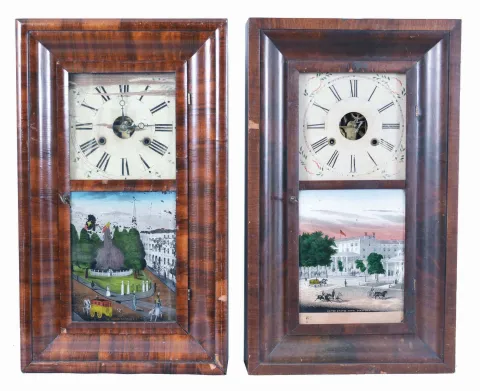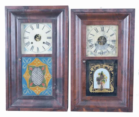 (1) Rosewood veneered case has some loss on the outer band, couple spots on the door and bottom case sides. Original painted dial has loss on the upper half. Original tablet has scattered loss. Original hands. Dark label inside; (2) Mahogany veneered case has some loss on the outer band and a small chip on the door. Original painted dial has some wear to the decorative flowers. Original tablet in nice condition. No hands. Clean label inside. (3) Mahogany veneered case in an old finish has small loss on the outer band corners and repairs on the door. Original painted dial has scattered loss. Mismatched hands. Original tablet has scatter loss. Clean label inside. (4) Rosewood veneered case in an old finish has loss on the outer band, the door and the sides bottom edge. Original painted dial has some scattered loss. Original tablet is broken. Replaced hands. Slight dark label inside. (5) Mahogany veneered case in an old finish has minor loss on the outer band. Painted dial in nice condition for its age. Original tablet. No hands. 6) Mahogany veneered case in original finish has a couple chips on the outer band. Original painted dial has scattered loss. Original hands. Original tablet has some loss in the center and the background. Clean label inside.