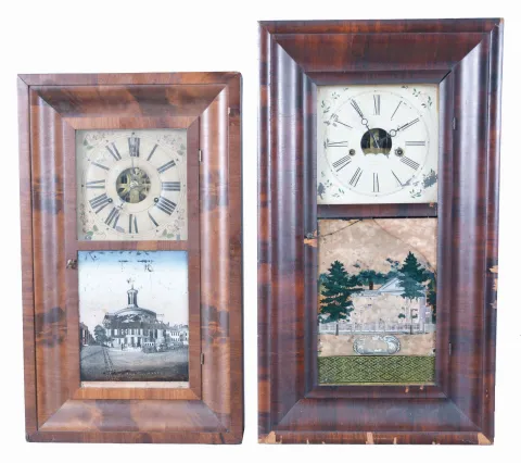 Clocks- 6 (Six): (1) Chauncey Jerome, New Haven, Conn., 30 hour, time and strike, weight brass movement OG shelf clock, c1850; (2) C. Boardman, Bristol, Conn., 30 hour, time and strike, weight brass movement OG shelf clock, c1845 (3) William L. Gilbert,