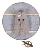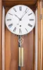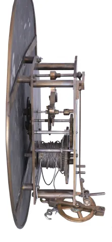 glue joints failed on door and there are now right angle steel brackets screwed to inside of door.. Case has only wax finish. Pendulum stick, pulley and beat scale are commensurate with weight driven movement, the bob is from another clock, but works ok. No crank.