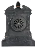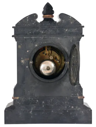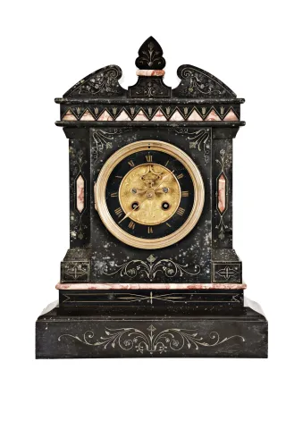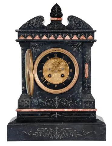 Marti & Cie, Paris, mantel clock, 8 day, time and strike, spring driven movement with visible Brocot escapement in an incised black slate case with red marble insets and molding, engraved sunk dial with black slate chapter ring with Roman numerals.