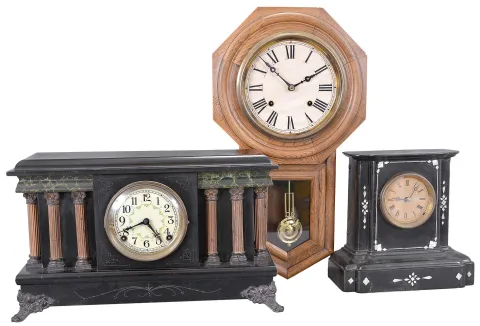 Clocks- 3 (Three) Clocks: (1) Sessions Clock Co.,Forestville, Conn., mantel clock, 8 day, time and strike, spring driven with a black enameled wood case; (2) Bradley and Hubbard Mfg. Co., West Meriden, Conn., mantel clock, 8 day, time and strike, spring driven with a black enameled metal case with mother of pearl inlay; (3) Asian, schoolhouse clock, 8 day, time and strike, spring driven with an oak case. all clocks will need mechanical and cosmetic work. Schoolhouse clock is missing glass. Dimensions given are for schoolhouse clock. Sold "as is".