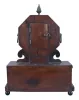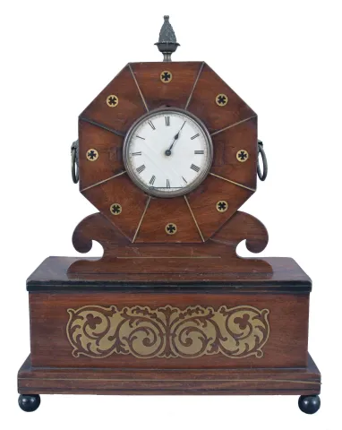 France, mantel clock, 8 day, time only, sping-driven movement with a cylinder escapement in a mahogany case with brass inlay on ball feet supporting a box with drawer that opens to the side, topped with an octagonal head holding a white paper dial with Roman numerals and metal finial. minute hand is off, trapped under the dial glass. One piece of string inlay is absent an the other will need to be secured. Glass has large crack. Feet are attached with modern screws. Movement ticks briskly when wound, but was not tested long term.