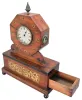 France, mantel clock, 8 day, time only, sping-driven movement with a cylinder escapement in a mahogany case with brass inlay on ball feet supporting a box with drawer that opens to the side, topped with an octagonal head holding a white paper dial with