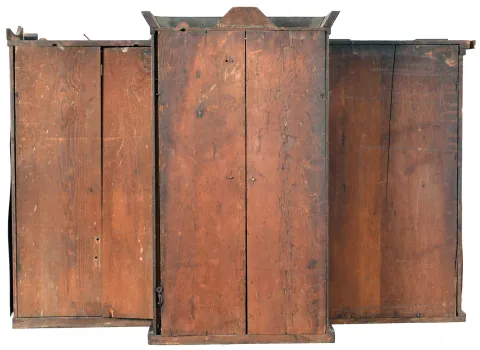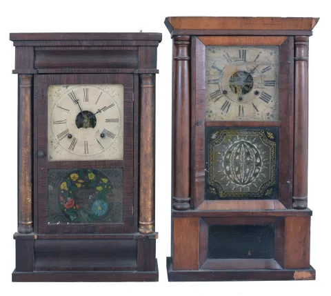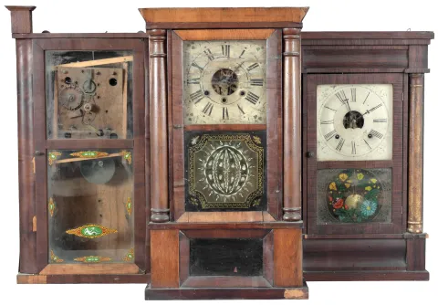 (1) Mahogany veneered case is in poor condition with loss and general lifting of the veneer. Various wooden parts are included. Dial and hands are missing; (2) Mahogany veneered case in an old finish has veneer loss on the base and cornice. There is also lifting veneer on the door and cornice. Original painted dial is in poor condition. Panel in the bottom section is painted over. Center tablet is in good condition. Alarm works are missing from the movement. Wrong hands. Dark lifting label. (3) Rosewood veneered case in original finish has some veneer loss on the base below the two gilt columns and small damage at the top right edge. Original painted dial as age darkened a little with some loss at the winding arbors and mounting pins. Original hands and tablet with some loss. Dark label inside.