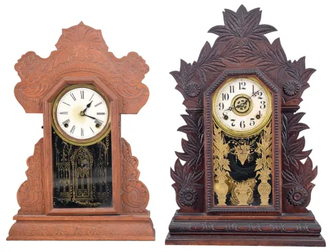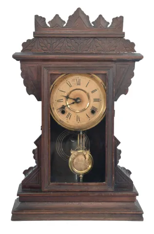 Clocks- 3 (Three): (1) Sessions Clock Co., Forestville, Conn., 8 day, time and strike, spring brass movement shelf clock, c. 1900; (2) William L. Gilbert Clock Co., Winsted, Conn., "Boston", 8 day, time and strike, spring brass movement shelf clock, c1900 (3) William L. Gilbert Clock Co., Winsted, Conn., "Leopard", 8 day, time and strike, spring brass movement shelf clock, c1891 (1) Refinished pressed oak case in nice condition. Paper dial has been replaced. Original hands, pendulum and tablet; (2) Pressed oak case in original finish. Paper dial looks to be replaced. Original tablet and pendulum. Minute hand has been repaired. Dark label on the back. (3) Walnut case in original finish. Original paper dial has age darkened and stained. Original hands and pendulum. Tablet replaced with clear glass.
