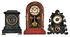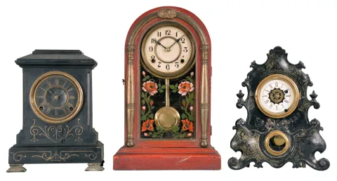 Clocks- 3 (Three): (1) Shing Lee Mfg. Co., Chefoo, China, 8 day, time and strike, spring brass movement round top shelf clock, c1910; (2) F. Kroeber Clock Co., New York, "Cabinet No. 2", 8 day, time and strike, spring brass movement wood case shelf clock, c1881 (3) Unknown, possibly by the American Clock Co., New York, 30 hour, time and alarm spring brass movement iron front shelf clock, c1865 (1) Red painted wood case has some dings and scratches to the finish. Original painted dial has stains and wear. Original hands and pendulum. Decoration on the glass looks to be original. Large label in Chinese on the back and an English label inside; (2) Ebonized wood case has some loss of gold in the incised lines. The case front has a shrinkage crack. Original black and gold dial has aged with a little surface abrasion. Period hands. Dark label on the back. (3) Iron front case has general loss of the gold decoration and painted flowers. Paper dial has been replaced. Period hands.