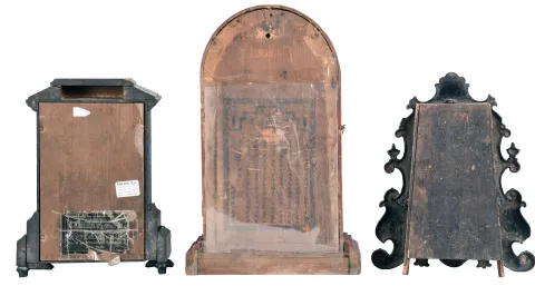 (1) Red painted wood case has some dings and scratches to the finish. Original painted dial has stains and wear. Original hands and pendulum. Decoration on the glass looks to be original. Large label in Chinese on the back and an English label inside; (2) Ebonized wood case has some loss of gold in the incised lines. The case front has a shrinkage crack. Original black and gold dial has aged with a little surface abrasion. Period hands. Dark label on the back. (3) Iron front case has general loss of the gold decoration and painted flowers. Paper dial has been replaced. Period hands.