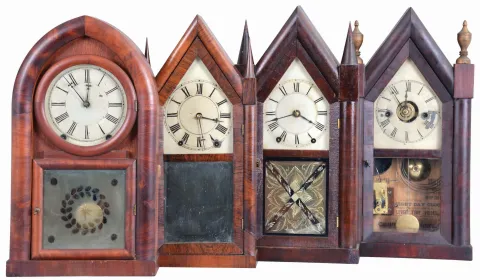 Clocks- 4 (Four): (1) Brewster & Ingrahams, Bristol, Conn., Steeple shelf clock with a spring driven 30 hour time and strike movement (iron back plate) in a mahogany veneered case, c1850; (2) Chauncey Jerome, New Haven, Conn., Steeple shelf clock with a