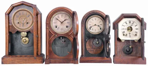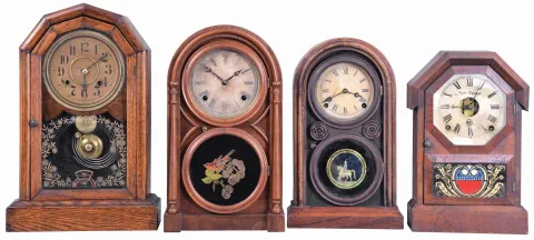 Clocks- 4 (Four): (1) Seth Thomas Clock Co., Plymouth Hollow, Conn., "Octagon Top" shelf clock with a spring driven, 8 day, time and strike lyre movement in a rosewood veneered case, c1865; (2) E. Ingraham & Co., Bristol, Conn., "Venetian" shelf clock