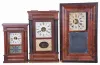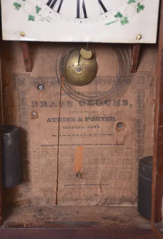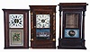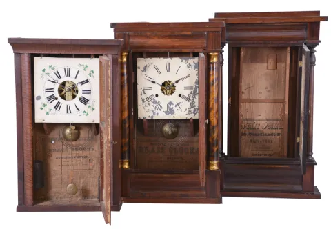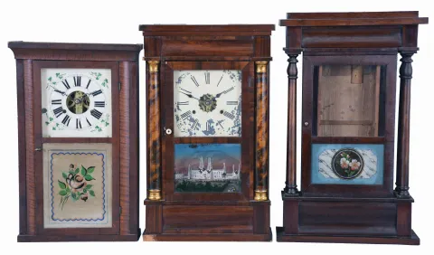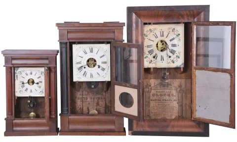 Clocks- 6 (Six) American shelf clocks: (1) Seth Thomas Clock Co., Plymouth Hollow, Conn., column shelf clock with a brass spring driven 30 hour time and strike movement in a mahogany case, c1850; (2) Atkins & Porter, Bristol, Conn., quarter column shelf clock with a weight driven 30 hour time and strike movement in a mahogany veneered case, c1845. (3) J. C. Brown, Forestville, Conn. half column shelf clock with a weight driven 30 hour time and strike movement in a mahogany veneered case, c 1850. (4) Seth Thomas, Plymouth Hollow, Conn., half column shelf clock with a weight driven 30 hour time and strike movement in a mahogany veneered case, c1855. (5) Sperry & Shaw, 10 Cortlandt St., New York., 4 column NY style case only, c1845. (6) Daniel Pratt, Reading, Mass OG shelf clock with a weight driven, 8 day, time and strike movement in a mahogany veneered case, c1860. (1) The case has been refinished, the dial has some loss and the door glasses are original and lower tablet by Wm. B. Fenn. The name on the movement has been over stamped (2) The case has some original finish, a touched up painted dial and original door glasses. (3) The case has some original finish, the original painted dial has some loss and the door glasses are original. (4) The case has been refinished, the original painted dial touched up and the door glasses are original with back side repainting to the lower glass. (5) The rosewood case finish is mostly original. The door has two excellent period glasses. There is no movement, dial, hands, weights or pendulum bob. (6) The case has some original finish with veneer loss. The original signed painted dial has loss at the lower right corner. The weights are missing. ***NOTE*** The dimensions are for clock no. 6.