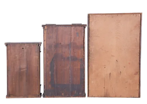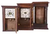 (1) The case has been refinished, the dial has some loss and the door glasses are original and lower tablet by Wm. B. Fenn. The name on the movement has been over stamped (2) The case has some original finish, a touched up painted dial and original door glasses. (3) The case has some original finish, the original painted dial has some loss and the door glasses are original. (4) The case has been refinished, the original painted dial touched up and the door glasses are original with back side repainting to the lower glass. (5) The rosewood case finish is mostly original. The door has two excellent period glasses. There is no movement, dial, hands, weights or pendulum bob. (6) The case has some original finish with veneer loss. The original signed painted dial has loss at the lower right corner. The weights are missing. ***NOTE*** The dimensions are for clock no. 6.
