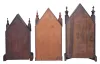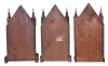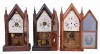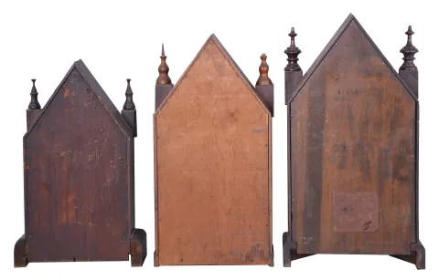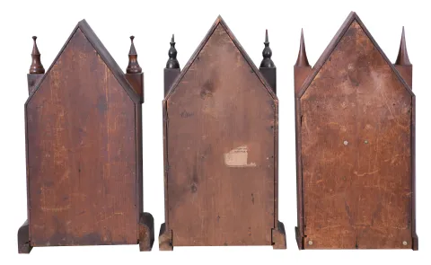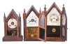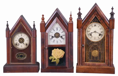 Clocks- 6 (Six): (1) Waterbury Clock Co., Waterbury, Conn., 30 hour, time, strike and alarm spring brass movement Sharp Gothic or steeple clock, c1870; (2) New Haven Clock Co., New Haven, Conn., 8 day, time and strike, spring brass movement Sharp Gothic or steeple clock, c1870 (3) William L. Gilbert Clock Co., Winsted, Conn., 8 day, time, strike and alarm Sharp Gothic or steeple clock, c1870 (4) Ansonia Clock Co., Ansonia, Conn., 30 hour, time and strike, spring brass movement Sharp Gothic or steeple clock, c1870 (5) Elisha Manross, Bristol, Conn., Sharp Gothic or steeple case only, c1850 (6) William L. Gilbert Clock Co., Winsted, Conn., 30 hour, time, strike and alarm spring brass movement Sharp Gothic or steeple clock, c1870 (1) Refinished mahogany veneered case has some small damage on the base and one finial tip broken off. Original painted dial has some loss at the winding arbors. Mismatched hands. Tablet has been restored. Clean label inside; (2) Refinished mahogany veneered case has loss the veneer on the base. Original painted dial has scattered loss and poor repairs to the numbers. Replaced hands. Original tablet has some scattered loss to the background. Dark label on the back. (3) Mahogany veneered case in original finish has minor loss on the base and some loss to the gilt moldings. Original painted dial is soiled at the winding arbors and loss at the mounting screws. Original hands and tablet. Dark label inside. (4) Mahogany veneered case in original finish has loss on the base, the upper left edge and a broken finial tip . Original painted dial has loss some staining and number wear. Minute hand is missing. Original tablet has loss in the center. Dark label inside. (5) Refinished mahogany and rosewood veneered case has loss on the base. Original balloon tablet and dial with scattered loss. Clean label inside. (6) Mahogany veneered case in an old finish has general veneer loss. Original painted dial has scattered loss and wear. Replaced hands. Original tablet has minor loss. Dark label inside.