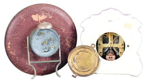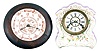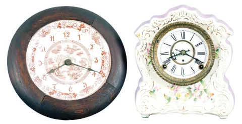 (1) Wood bezel incorporating a porcelain plate in the chinese style originally had plush fabric glued to the bezel. Original hands; (2) White front with lavender sides has some minor wear to the applied gold. Paper dial has been replaced. Original hands.
