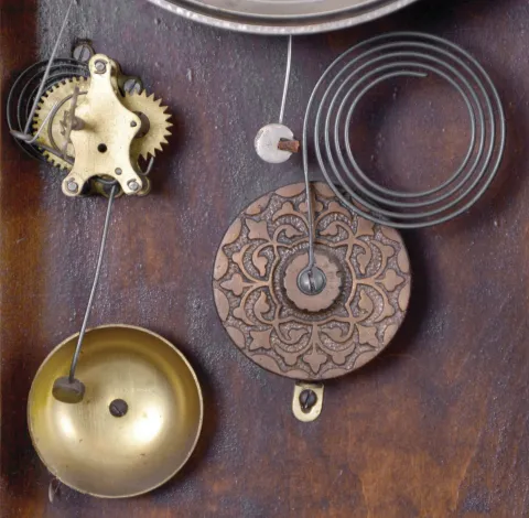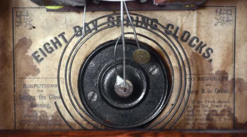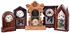 (1) Refinished oak case in nice condition. Original paper dial has poor repairs to the numbers. Original tablet; (2) Refinished mahogany and rosewood veneered case has some loss on the base and couple chips on the door. Original painted dial has scattered loss. Original hands and replaced tablet. Stained label inside. (3) Walnut case in original finish has loss it's top. Original paper dial has some surface abrasion and stains. Original tablet, pendulum and hands. (4) Rosewood veneered case in an old finish has minor veneer loss on the top right edge. Original dial has been repainted. Original hands. Stained label inside, (5) Rosewood veneered case in an old finish has some loss on the right molded front and the base. Original painted dial is soiled at the winding arbors. Original hands. Bottom tablet now clear. Dark label inside.