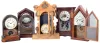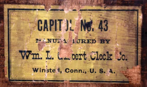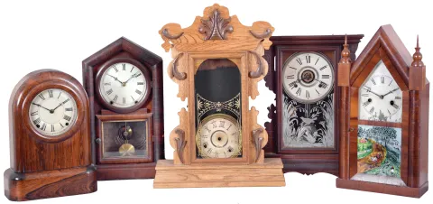Clocks- 5 (Five): (1) William L. Gilbert Clock Co., Winsted, Conn., "Capital No. 43", case only; (2) New Haven Clock Co., New Haven, Conn., 30 hour, time and strike, spring brass movement Sharp Gothic or steeple clock c1860 (3) William L. Gilbert Clock Co