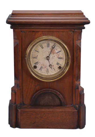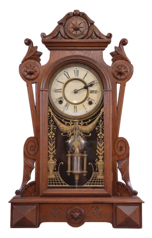 Clocks- 2 (Two): (1) F. Kroeber Clock Co., New York, "Juniata", 8 day, time and strike, spring brass movement shelf clock, c1875; (2) Unknown, 8 day, time and strike, spring brass movement mantel clock, c1880