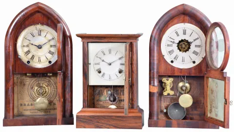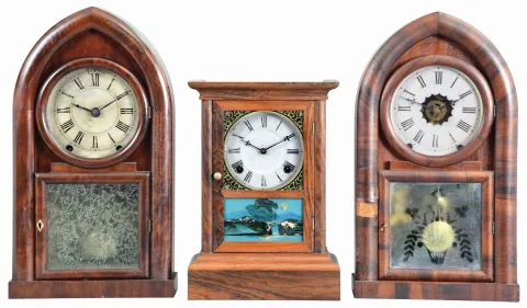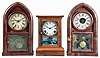Clocks- 3 (Three): (1) Atkins Clock Co., Bristol, Conn., "Cottage XX" shelf clock with a spring driven, 8 day, time and strike movement in a rosewood veneered case, c1860; (2) Brewster & Ingrahams, Bristol, Conn., "Round Gothic" or "Beehive" shelf clock