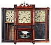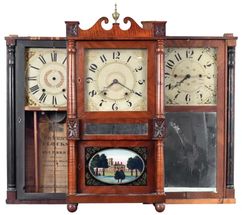 Clocks- 3 (Three): American shelf clocks: (1) Eli Terry, made for George Steel, Horton, Nova Scotia half column shelf clock with a weight driven 30 hour time and strike wooden works movement in a mahogany veneered case, c1835; (2) Chauncey Boardman, Bristol, Conn., stenciled half column and splat shelf clock with a weight driven 30 hour time and strike movement in a mahogany veneered case, c1835. (3) T. M. Roberts Bristol, Conn. for Henry Hart double decker shelf clock with a weight driven 30 hour time and strike wooden movement in a mahogany and maple case, c1835 (1) There is veneer loss in several areas. The case top (chimneys and splat) is missing as are the hands, door glasses and weights; (2) The case has significant veneer loss and the top is currently disassembled and inside the case. The painted dial has horizontal loss lines. (3) The case has been refinished. There are several areas of veneer loss. The original painted dial has darkened with age around the edge. The hands are original. The scroll appears old and other examples of T. M. Roberts clocks are known with this scroll top. The finial is a modern replacement. The lower tablet is a replacement. The center mirror is newer.