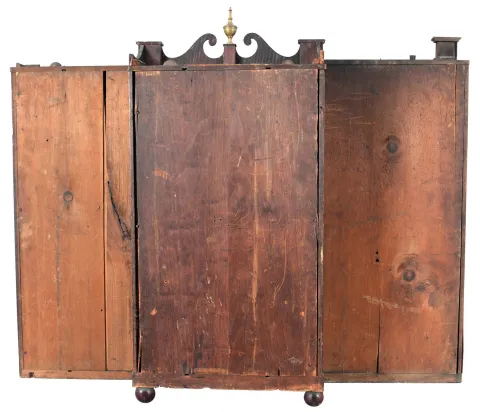 (1) There is veneer loss in several areas. The case top (chimneys and splat) is missing as are the hands, door glasses and weights; (2) The case has significant veneer loss and the top is currently disassembled and inside the case. The painted dial has horizontal loss lines. (3) The case has been refinished. There are several areas of veneer loss. The original painted dial has darkened with age around the edge. The hands are original. The scroll appears old and other examples of T. M. Roberts clocks are known with this scroll top. The finial is a modern replacement. The lower tablet is a replacement. The center mirror is newer.