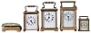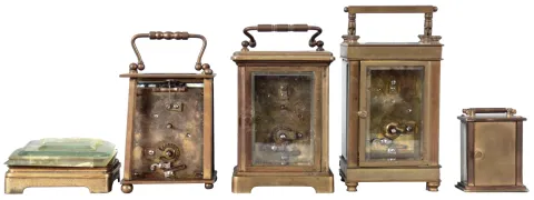 Clocks- 4 (Four) Carriage: Three French carriage clocks, 8 day, time only, two with cylinder escapements and one with a lever. The fourth clock is a Waterbury Clock Co. "Midge" 30 hour, spring driven, lever escapement miniature carriage clock, c1909. one of the French clocks needs to have case parts reassembled. It is also missing a minute hand. The two cylinder escapement French clocks have broken balance staffs. All clocks have very dark brass patina. The largest French clock and the Midge tick and stop. Dimensions provided for largest French clock. Sold "as is".