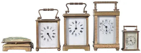 Clocks- 4 (Four) Carriage: Three French carriage clocks, 8 day, time only, two with cylinder escapements and one with a lever. The fourth clock is a Waterbury Clock Co. "Midge" 30 hour, spring driven, lever escapement miniature carriage clock, c1909.