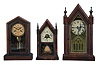 Clocks- 5 (Five): (1) New Haven Clock Co., New Haven, Conn., "Sharp Gothic" shelf clock with a spring driven, 8 day, time and strike movement in a mahogany veneered case, c1880; (2) Jerome & Co., New Haven, Conn., miniature steeple shelf clock with a