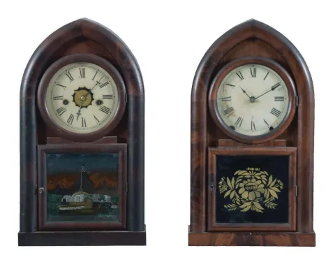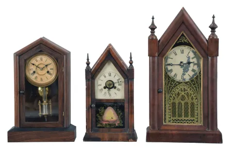 Clocks- 5 (Five): (1) New Haven Clock Co., New Haven, Conn., "Sharp Gothic" shelf clock with a spring driven, 8 day, time and strike movement in a mahogany veneered case, c1880; (2) Jerome & Co., New Haven, Conn., miniature steeple shelf clock with a spring driven 30 hour time and alarm movement in a mahogany veneered case, c1870. (3) F. Kroeber Clock Co., New York, "Dictator" shelf clock with a spring driven 30 hour time and strike movement in a rosewood veneered case, c1885. (4) Brewster & Ingrahams, Bristol, Conn., Round Gothic shelf clock with a spring driven, 8 day, time and strike movement in a mahogany veneered case, c1850, (5) Waterbury Clock Co., Waterbury, Conn., Round Gothic shelf clock with a spring driven 30 hour time, strike and alarm movement in a mahogany veneered case, c1865. (1) Minor veneer loss. original finish; original painted dial with substantial loss; very sharp original door glass; (2) Multiple areas of small veneer loss. Original finish. Original painted dial and hands. Both door glasses are original. (3) Original finish; original paper dial has yellowed; original hands; original door glass; (4) Very minimal veneer loss; case has some original finish; original painted dial replaced with a paper dial; hands are period and may be original; top door glass is original; bottom tablet replaced. (5) The case has very minor veneer loss on the base returns; finish is original; the painted dial and hands are original; the door glasses are original. ***NOTE*** Dimensions are for clock number 1.
