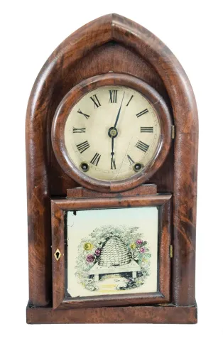 Brewster & Ingrahams, Bristol, Conn., 8 day, time and strike, spring brass movement round gothic or beehive clock. Mahogany veneered case in what looks to be a modern finish over an old and possibly original finish has some small chips on the bottom left side. Original painted wood dial has a partial hairline crack and some wear and stains. Replaced hands and tablet. Movement is signed and has original brass springs.