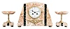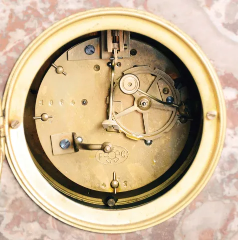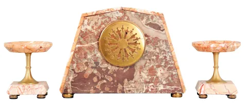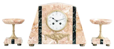 France, 3 piece mantel garniture set, 8 day, time and strike, spring driven movement, Art Deco case of polychrome pink marble with dark marble accents, applied metal ornaments, white enamel dial, and pair of matching tazze. Brass Pendule de Paris movement is signed "FC". very small edge chip on case that are very hard to see. Retailer name printed on dial is indistinct. Convex beveled glass is fine. Hands are mismatched. Movement ticks and strikes but was not tested long term.