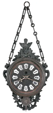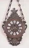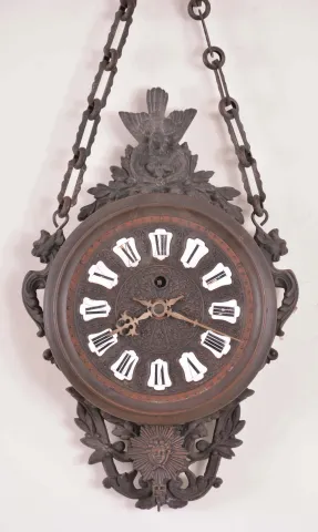 Clocks- 2 (Two), the first probably Germany, hanging softwood case, Roman numeral white painted dial with bird above the chapter ring, and with blue and red fan corners, 30 hour weight driven timepiece movement with brass weight, the next a New Haven "Chatelaine", brass case with cast ornament, brass dial with Roman numeral, white enamel cartouches,30 hour timepiece movement with Medusa pendulum, together with a Dungan and Klump "Dickory Dickory Dock" case only German clock with losses, movement complete, dial dirty, will tick, New Haven case with heavy tarnish, bottom ornament with crack, ticking, Dungan & Klump with damage to case