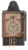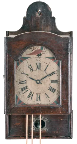Clocks- 2 (Two), the first probably Germany, hanging softwood case, Roman numeral white painted dial with bird above the chapter ring, and with blue and red fan corners, 30 hour weight driven timepiece movement with brass weight, the next a New Haven