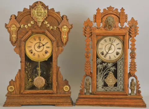 Clocks- 2 (Two): (1) Seth Thomas Clock Co., Thomaston, Conn., 8 day, time and strike, spring brass movement shelf clock. We could not find this model in the catalog, but was a premium series adapted from the applied brasses series, c1900; (2) E. Ingraham & Co., Bristol, Conn., "Shekel", 8 day, time and strike, spring brass movement shelf clock, c1891 (1) Oak case has lost most of its finish. Original paper dial has age darkened with some surface abrasion. Original hands, pendulum and tablet that has a little wear; (2) Oak case in original finish in overall nice condition. The cast ornaments have some remains of original gilding. Original paper dial has stains and has age darkened. Original hands, pendulum and tablet. Remains of a label on back of case.