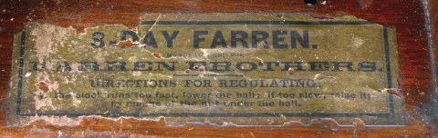 (1) The case retains most of the original finish. The original paper dial has aged and been covered with a finish. The hands are replacements. The movement is signed. The door glass is original; (2) The case retains original finish. The original paper dial has aged with color. The hands are original. The stenciled door glass is original. The movement is signed. Paper label in case bottom notes model. (3) The case has been refinished. The original paper dial shows wear. The hands are original. The pendulum rod and bob are missing. The movement is signed. The stenciled door glass is original. Note: The largest dimensions are for clock number 3.