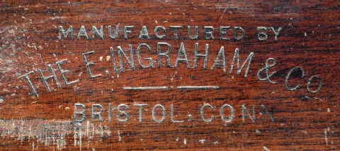 Clocks- 3 (Three): (1) E. Ingraham & Co.,Bristol, Conn., "Cartoon" shelf clock with a spring driven, 8 day, time and strike movement in a walnut case, c1889; (2) E. Ingraham & Co., Bristol, Conn., "Farren" premium model made for Farren Brothers shelf clock with a spring driven, 8 day, time and strike movement in a walnut case, c1880. (3) E. Ingraham & Co., Bristol, Conn., "Ingot" shelf clock with a spring driven, 8 day, time and strike movement in a walnut case, c1896. (1) The case retains most of the original finish. The original paper dial has aged and been covered with a finish. The hands are replacements. The movement is signed. The door glass is original; (2) The case retains original finish. The original paper dial has aged with color. The hands are original. The stenciled door glass is original. The movement is signed. Paper label in case bottom notes model. (3) The case has been refinished. The original paper dial shows wear. The hands are original. The pendulum rod and bob are missing. The movement is signed. The stenciled door glass is original. Note: The largest dimensions are for clock number 3.