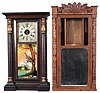 Clocks- 3 (Three): American shelf clocks: (1) Marsh, Gilbert & Co., Farmington, Conn., carved half column and carved eagle splat shelf clock with a weight driven 30 hour time and strike movement in a mahogany veneered case, c1833; (2) Boardman & Wells,