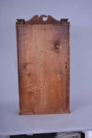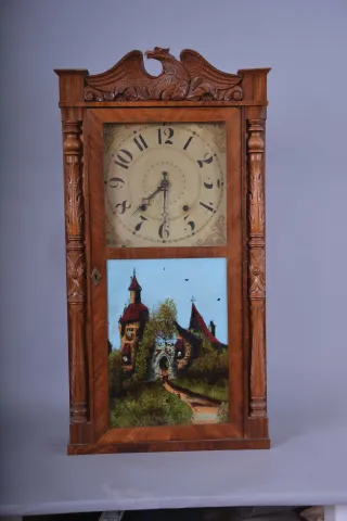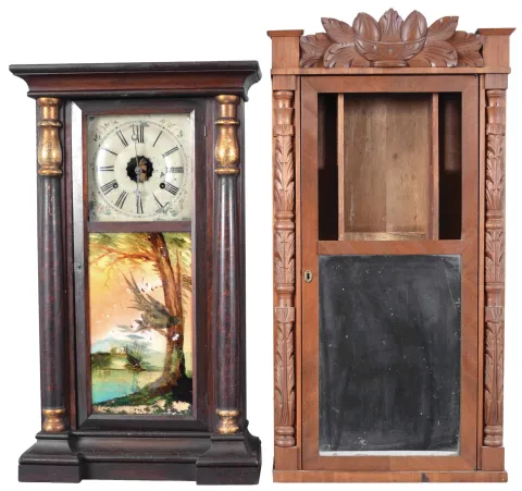 Clocks- 3 (Three): American shelf clocks: (1) Marsh, Gilbert & Co., Farmington, Conn., carved half column and carved eagle splat shelf clock with a weight driven 30 hour time and strike movement in a mahogany veneered case, c1833; (2) Boardman & Wells, Bristol, Conn., carved half column and carved splat case only, c1835. (3) Solomon C. Spring, Bristol, Conn., half column shelf clock with a weight driven, 8 day, time and strike strap brass movement in a rosewood veneered case, c1860. (1) The case has been refinished. The original painted dial has some loss at the screw holes. The hands appear original. The lower door glass has been replaced; (2) The case has been lightly refinished. The door mirror has age. (3) The case has original finish with veneer loss in several areas. The column gilt caps and bases have some loss. The original painted dial has loss. The hands are incorrect. The glass tablet has some flaking and back painting and is old, if not period. The 8 day weights are missing, ***NOTES*** The dimensions are for clock number 1.