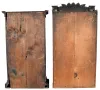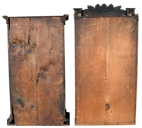 (1) The case has been refinished. The original painted dial has some loss at the screw holes. The hands appear original. The lower door glass has been replaced; (2) The case has been lightly refinished. The door mirror has age. (3) The case has original finish with veneer loss in several areas. The column gilt caps and bases have some loss. The original painted dial has loss. The hands are incorrect. The glass tablet has some flaking and back painting and is old, if not period. The 8 day weights are missing, ***NOTES*** The dimensions are for clock number 1.