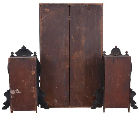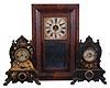 All clocks will need service. The position of the winding above the center arbor on the ogee suggests has the scarce Forestville movement The Waterbury is missing alarm setting ring, the dial is loose, and paint fading. The American Clock Co. has a stained paper dial. Dimensions provided are for the ogee clock. Sold "as is".