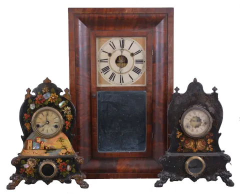 Clocks- 3 (Three) American Shelf: (1) Connecticut, probably Forestville Mfg. Co., Bristol, ogee clock, 30 hour, weight driven time and strike in a walnut veneer case; (2) American Clock Co., New York, iron front shelf clock with 30 hour, time and strike, spring driven movement with a hand painted waterfront scene surrounded by flowers; (3) Waterbury Clock Co., Waterbury, Conn., iron front shelf clock with 30 hour, time and strike with alarm, spring driven movement with a hand painted flowers. All clocks will need service. The position of the winding above the center arbor on the ogee suggests has the scarce Forestville movement The Waterbury is missing alarm setting ring, the dial is loose, and paint fading. The American Clock Co. has a stained paper dial. Dimensions provided are for the ogee clock. Sold "as is".