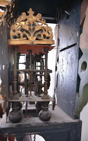 the lead trim from the right side of the clock has broken away, included in plastic bag attached to movement. Weight is later and just a bit light to accomplish strike function The "stoehl" or case has been repainted to a dark green and the mermaids nicely repainted. Dial has been cleaned and paint touched up. Time/strike portion of movement is sound and complete, but very dirty; alarm mechanism is absent.