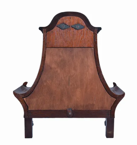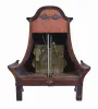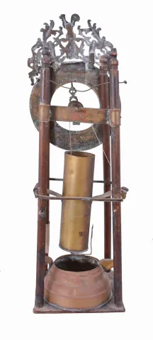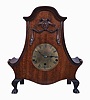 Clocks- 2 (Two) Wood and Brass: (1) Reproduction Clepsydra or water clock with cast brass crest and chapter ring, distressed wood pillars, woodworm holes in base, and rustic metalwork. The single hand is meant to move as water drips slowly from the cylindrical tank into the collection basin below; (2) Uhrenfabrik M,hlheim M,ller & Co., Germany, mantel clock, 8 day, three-train Westminster chime, spring driven movement stamped with the lion and "U.M." trademark in a curved mahogany case with ball-and-claw front feet and brass dial. (1) this piece will need attention, especially the right front leg which is broken. Dimensions provided are for the water clock; (2) case is either homemade or has been completely refinished. Minute hand is too short and pendulum bob is a new replacement. Glued repairs toe applied molding and one claw foot. Sold "as is".