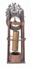 Clocks- 2 (Two) Wood and Brass: (1) Reproduction Clepsydra or water clock with cast brass crest and chapter ring, distressed wood pillars, woodworm holes in base, and rustic metalwork. The single hand is meant to move as water drips slowly from the