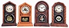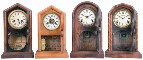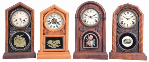 Clocks- 4 (Four): (1) E. Ingraham & Co., Bristol, Conn., "Doric" shelf clock with a spring driven 30 hour time and strike movement in a rosewood veneered case, c1880; (2) E. Ingraham & Co., Bristol, Conn., "Octagon Doric Mosaic" shelf clock with a spring