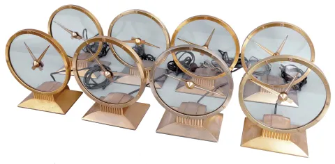 Clocks- 8 (Eight) Jefferson Electric Company, Bellwood, Illinois, "Golden Hour" electric mystery clock with hands suspended in clear glass dial in gold plated cases with classic mid-century modern design. clocks are in overall good cosmetic condition, a few with replaced cords. Clocks were not tested. Sold "as is".
