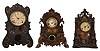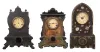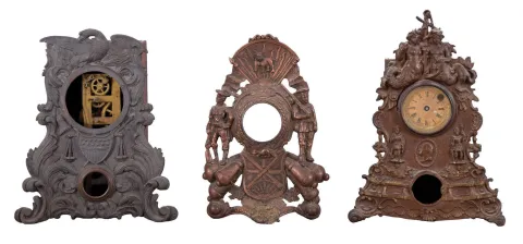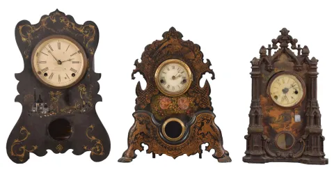 Clocks- 9 (Nine): (1) American iron front case (no movement) c1860; (2) American iron front shelf clock with a spring driven, 8 day timepiece movement, c1860. (3) American iron front shelf clock with a 30 hour timepiece movement and a "Mermaid Times"